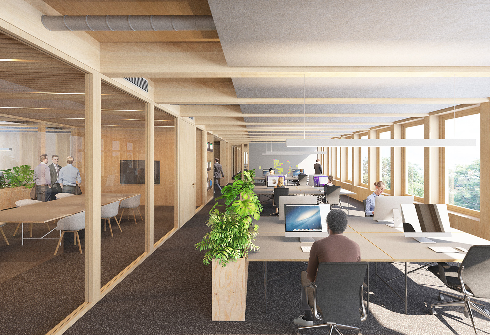 Entwurf Die begrünten Erdwälle, die den Betriebshof visuell vom Friedhof trennen, werden erhalten und nördlich erweitert. Das Gelände wird in zwei Bereiche gegliedert: Westlich stehen die Multifunktionshalle und das Personalgebäude, der östliche Bereich ist den Freilagern vorbehalten. Die Gebäude werden weitläufig auf der Fläche platziert und rahmen großzügig einen Hof. Die bestehende Halle wird in ihrer tragenden Struktur erhalten und erweitert. So entsteht ein 145 Meter langes Gebäude, das im Osten die Fahrzeuge und im Westen die Lager und Werkstätten aufnimmt. Es ist über die gesamte Länge beidseitig befahrbar. Das zweigeschossige Personalgebäude entsteht an der nördlichen Grundstücksgrenze, um eine gute Übersicht über das Gelände und dessen Zufahrten zu gewährleisten. Es verfügt über einen zentralen Treppenraum, über den die vier Funktionsbereiche erschlossen werden: Im Erdgeschoss die Umkleiden und Räume der Gärtnerei und des betriebliches Gesundheitsmanagements, im Obergeschoss die Büros und die Kantine. Zwei große Terrassen im Obergeschoss erweitern auf beiden Seiten des Gebäudes als Freibereiche die Kantine und die Besprechungsräume.
