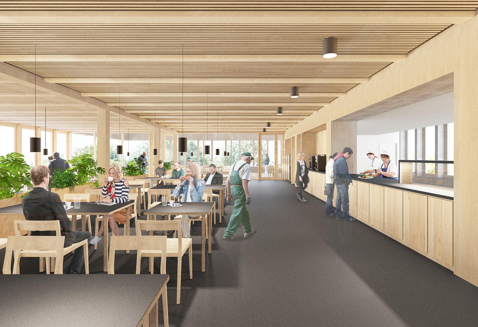 Entwurf Die begrünten Erdwälle, die den Betriebshof visuell vom Friedhof trennen, werden erhalten und nördlich erweitert. Das Gelände wird in zwei Bereiche gegliedert: Westlich stehen die Multifunktionshalle und das Personalgebäude, der östliche Bereich ist den Freilagern vorbehalten. Die Gebäude werden weitläufig auf der Fläche platziert und rahmen großzügig einen Hof. Die bestehende Halle wird in ihrer tragenden Struktur erhalten und erweitert. So entsteht ein 145 Meter langes Gebäude, das im Osten die Fahrzeuge und im Westen die Lager und Werkstätten aufnimmt. Es ist über die gesamte Länge beidseitig befahrbar. Das zweigeschossige Personalgebäude entsteht an der nördlichen Grundstücksgrenze, um eine gute Übersicht über das Gelände und dessen Zufahrten zu gewährleisten. Es verfügt über einen zentralen Treppenraum, über den die vier Funktionsbereiche erschlossen werden: Im Erdgeschoss die Umkleiden und Räume der Gärtnerei und des betriebliches Gesundheitsmanagements, im Obergeschoss die Büros und die Kantine. Zwei große Terrassen im Obergeschoss erweitern auf beiden Seiten des Gebäudes als Freibereiche die Kantine und die Besprechungsräume.