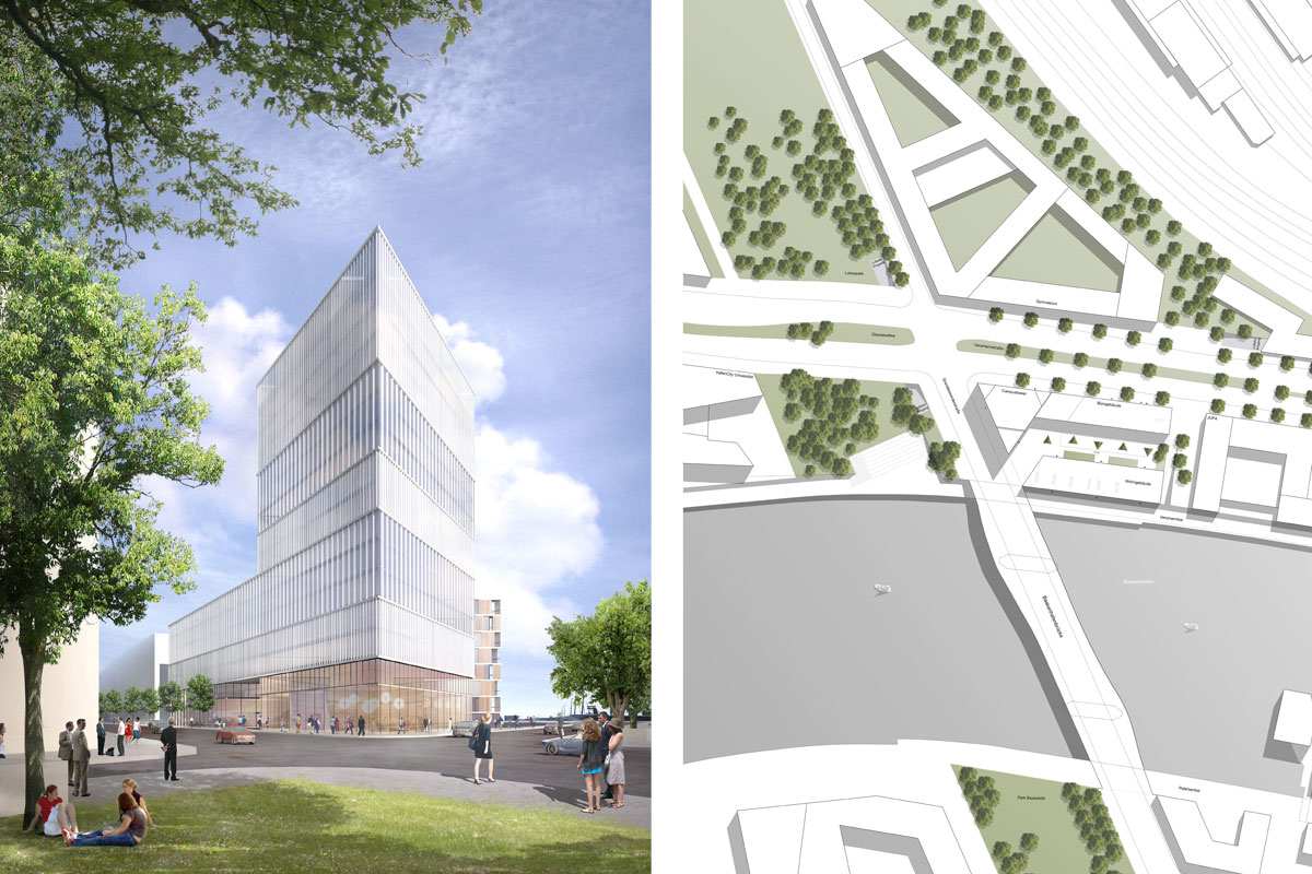 Der Campustower befindet sich am Kreuzungspunkt Baakenhafenbrücke und Versmannstraße. Er ist das Auftaktprojekt für eine neue städtebauliche Entwicklung in der HafenCity, an der Schnittstelle zwischen dem Quartier "Am Lohsepark", dem Baakenhafenquartier und dem künftigen Oberhafenquartier. Die Bedeutung des Standorts wird stadtplanerisch mit der Entscheidung für ein Turmgebäude ablesbar gemacht. Ziel des Konzepts ist es, der markanten dreiecksförmigen Grundrissform des Büroturms auch im Aufriss ein prägnantes und dynamisches Erscheinungsbild zugeben. Die Fassade wird dazu mit verschiedenen filigranen, vertikalen Strukturen aus Metalllisenen umhüllt, die den Turm höher wirken lassen.Gleichzeitig wird eine horizontale Gliederung vorgenommen, die mehrere Geschosse zu einzelnen Bändern optisch zusammenfasst und Turm und Riegel als bauliche Einheit herausarbeitet. Das Erdgeschoss bildet zusammen mit dem ersten Obergeschoss eine weitere gestalterische Einheit, die städtebaulich den Durchgang zwischen Turm und Riegel integriert. Es entsteht eine transparente Sockelzone, über die das Gebäude elegant mit dem Stadtraum verschmilzt. Zur Wasserseite wird die besondere Lage des Wohngebäudes am Eingang zum Baakenbecken mit einer horizontalen Fassadengestaltung herausgearbeitet, die geschossweise durch vertikale Elemente rhythmisiert wird. Die Deckenstirnkanten, Brüstungen, Schiebeläden, vor- und zurückspringende Fensterelemente und Loggien liegen in unterschiedlichen Ebenen und verleihen der Fassade Tiefe und damit ein abwechslungsreiches Erscheinungsbild.
